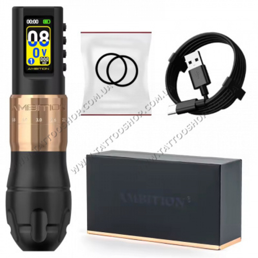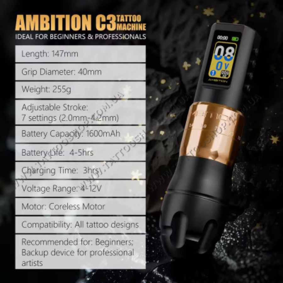 Ambition С3 Coreless Motor 7- це високоякісна татуювальна машинка від компанії Ambition, виготовлена з алюмінієвого сплаву. Довжина - 147 мм, товщина - 40 мм, вага - 255 г. Вона має вишуканий зовнішній вигляд, зручна у триманні і збалансована за вагою. Супер функціонал по регулюванню ходу голки. 7 налаштувань - 2.0-2.3-2.6-3.0-3.4-3.8-4.2 мм. Виліт голки регулюється тримачем.