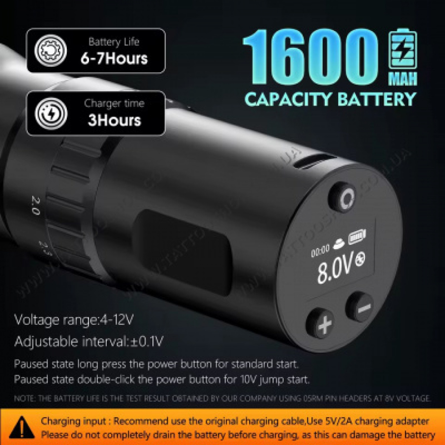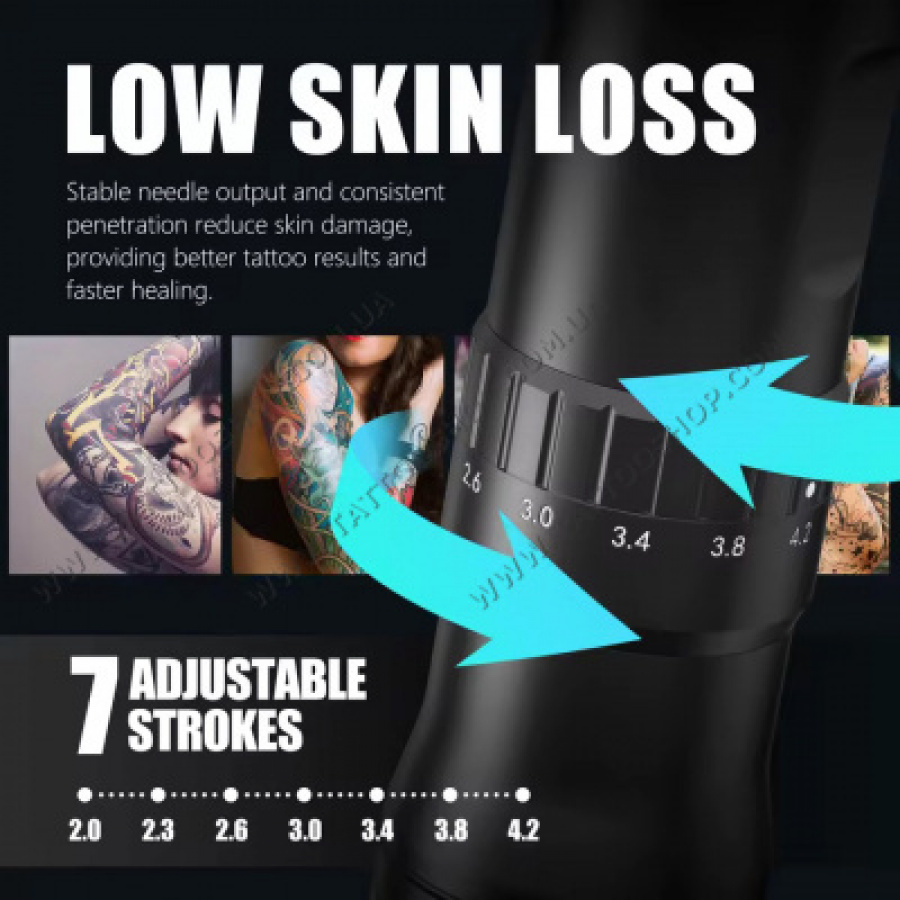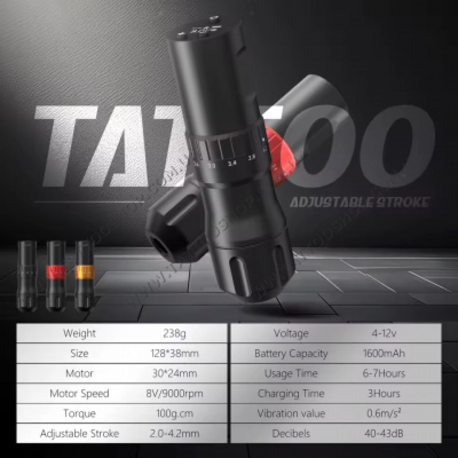 Ця тату-машинка оснащена безсердечним двигуном, який може розвивати надвисоку швидкість 9000 об/хв при напрузі 8 В. Він має надзвичайно високу потужність і дуже підходить для кольорового пакування, штрихування та підкладки.